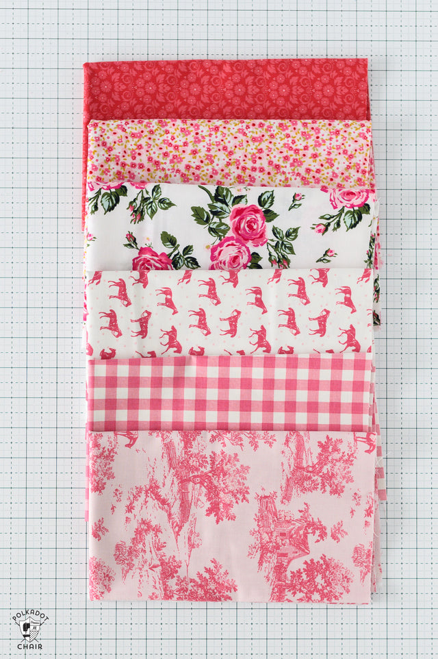 Six one half yard cuts of quilting cotton. Each piece of fabric in the bundle is approximately 1/2 yard.